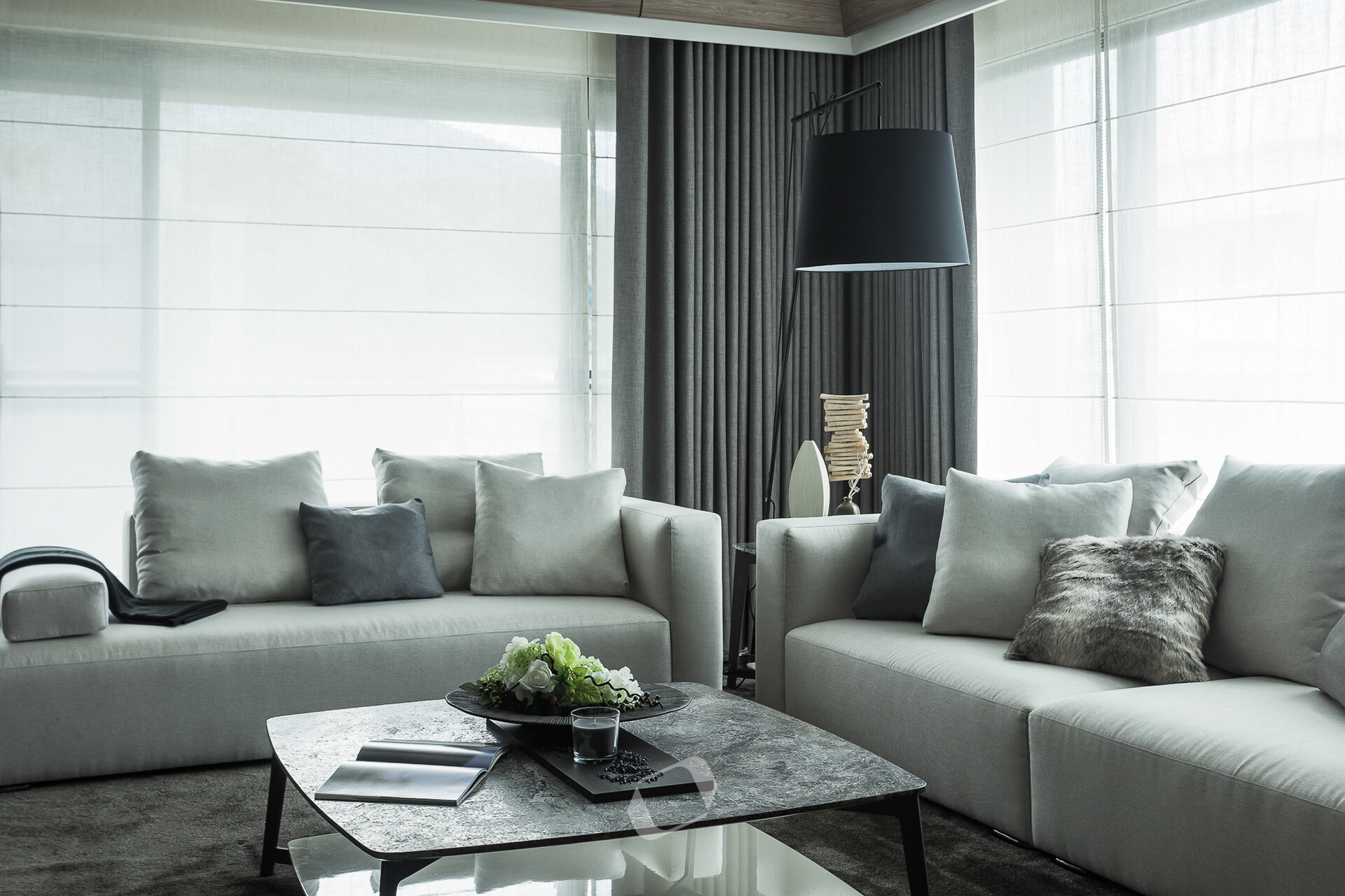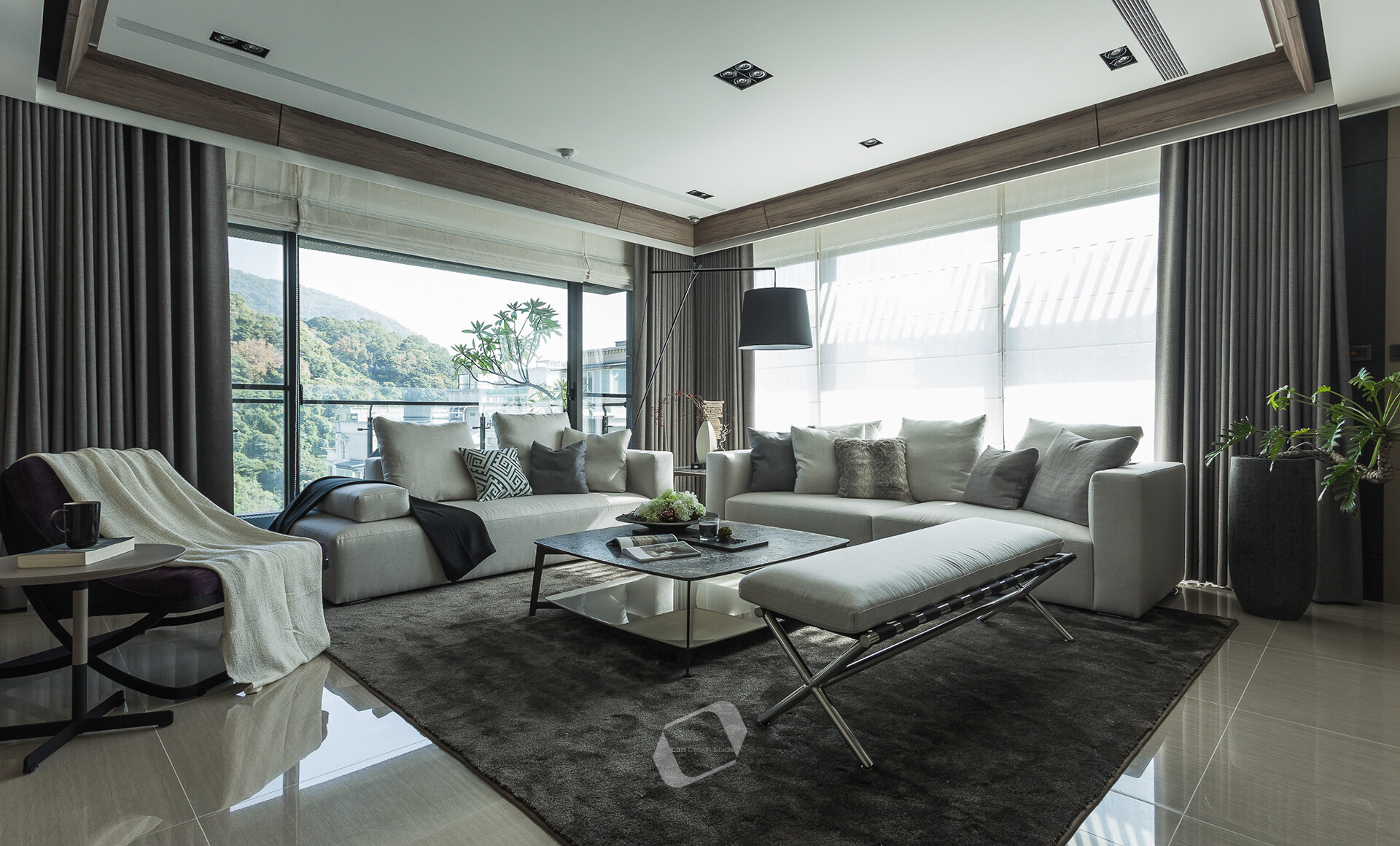 天花板的木作有山的大氣、隔間石牆的灰綠有著戶外山景的餘韻、餐桌的擺飾是季節的餽贈,室內利用自然元素呼應戶外靈動綠意。起居室牆面以精品空間的鍍鈦版和皮革繃面呈現,沉靜中有華麗。