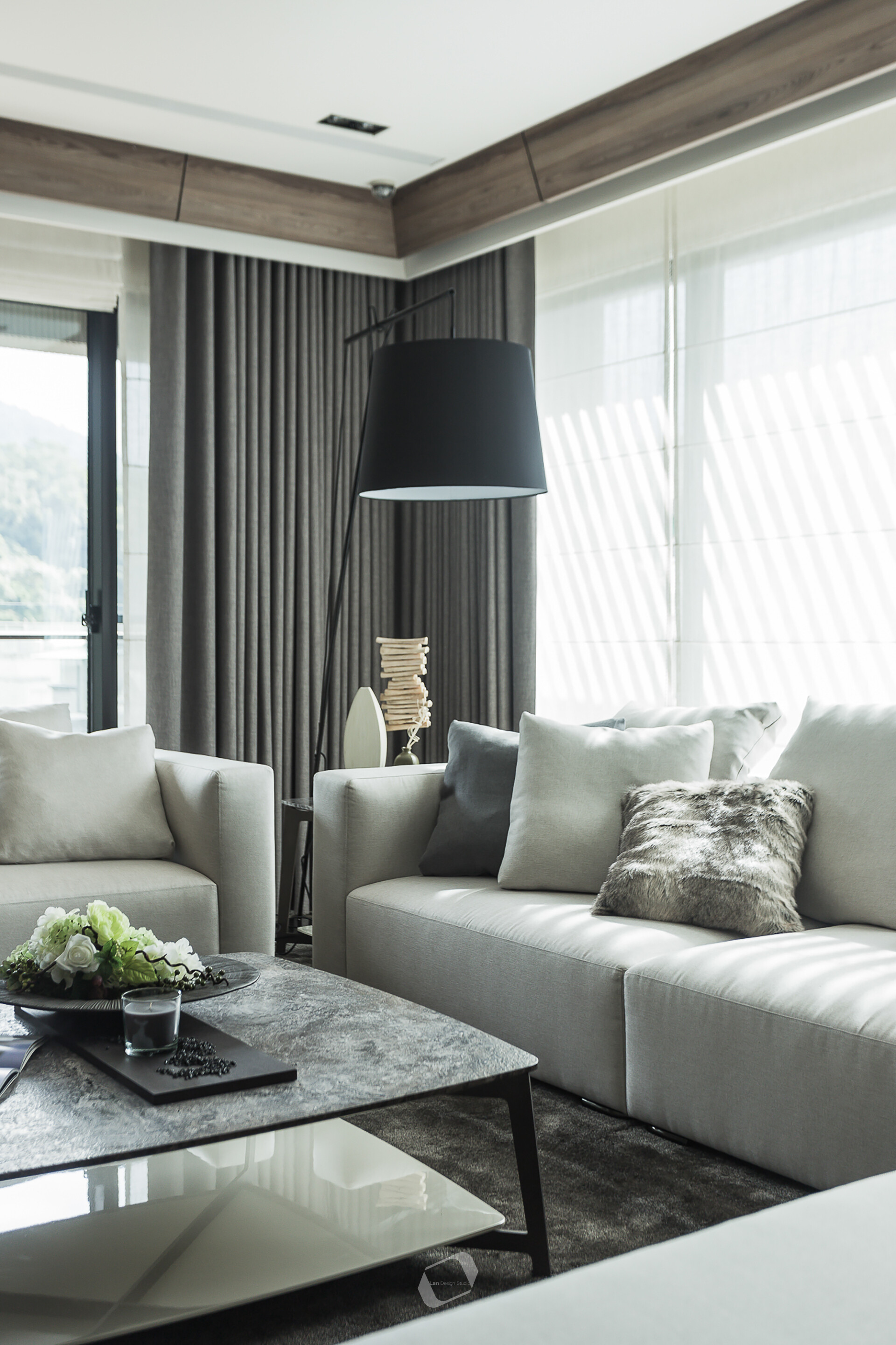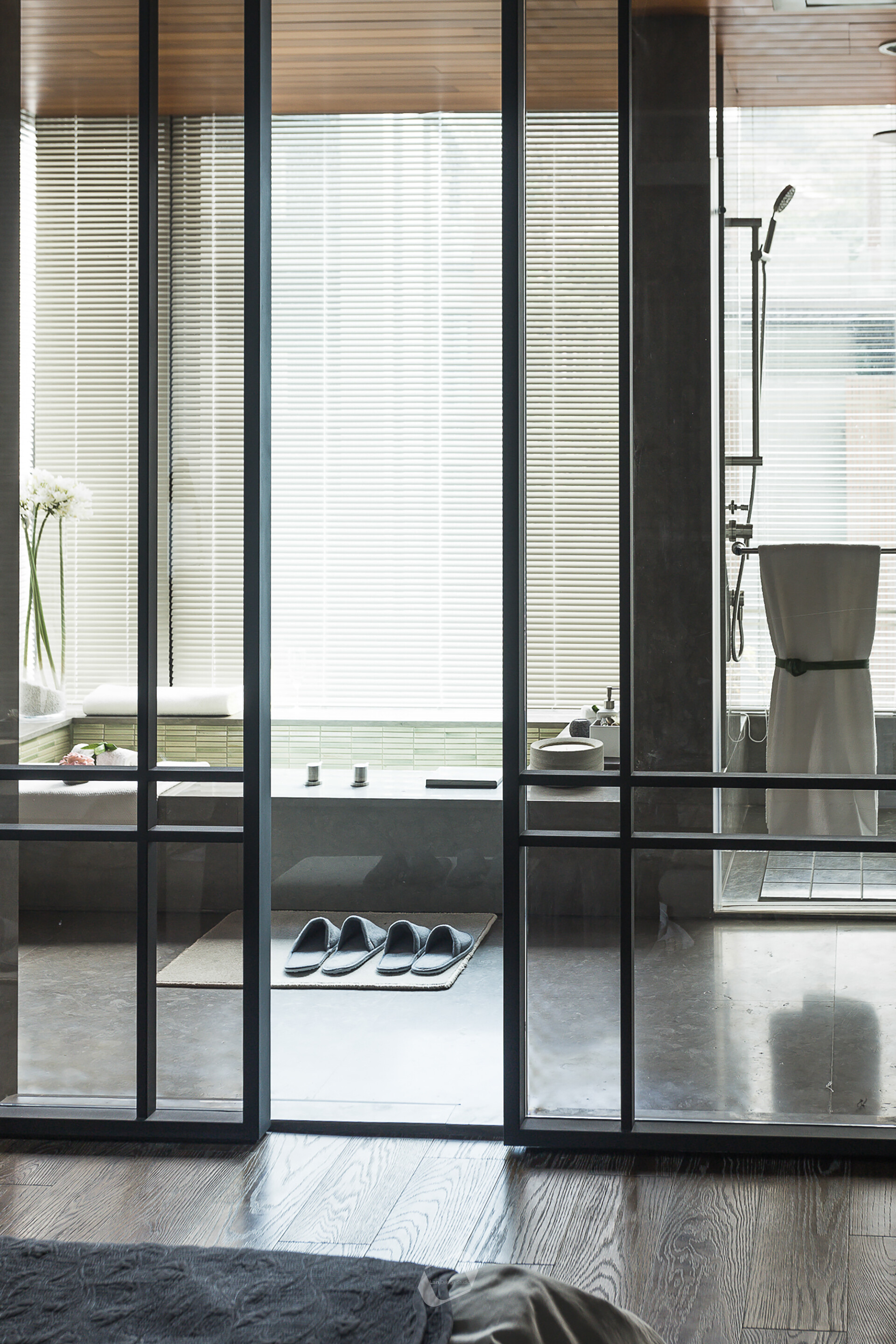 磺溪半山腰倚竹林的悠揚場域,涵碧氣質、一窗一景,利用玻璃拉門邀山景入室、百葉窗引日光共舞,敞朗視野與個人隱私兼具。
